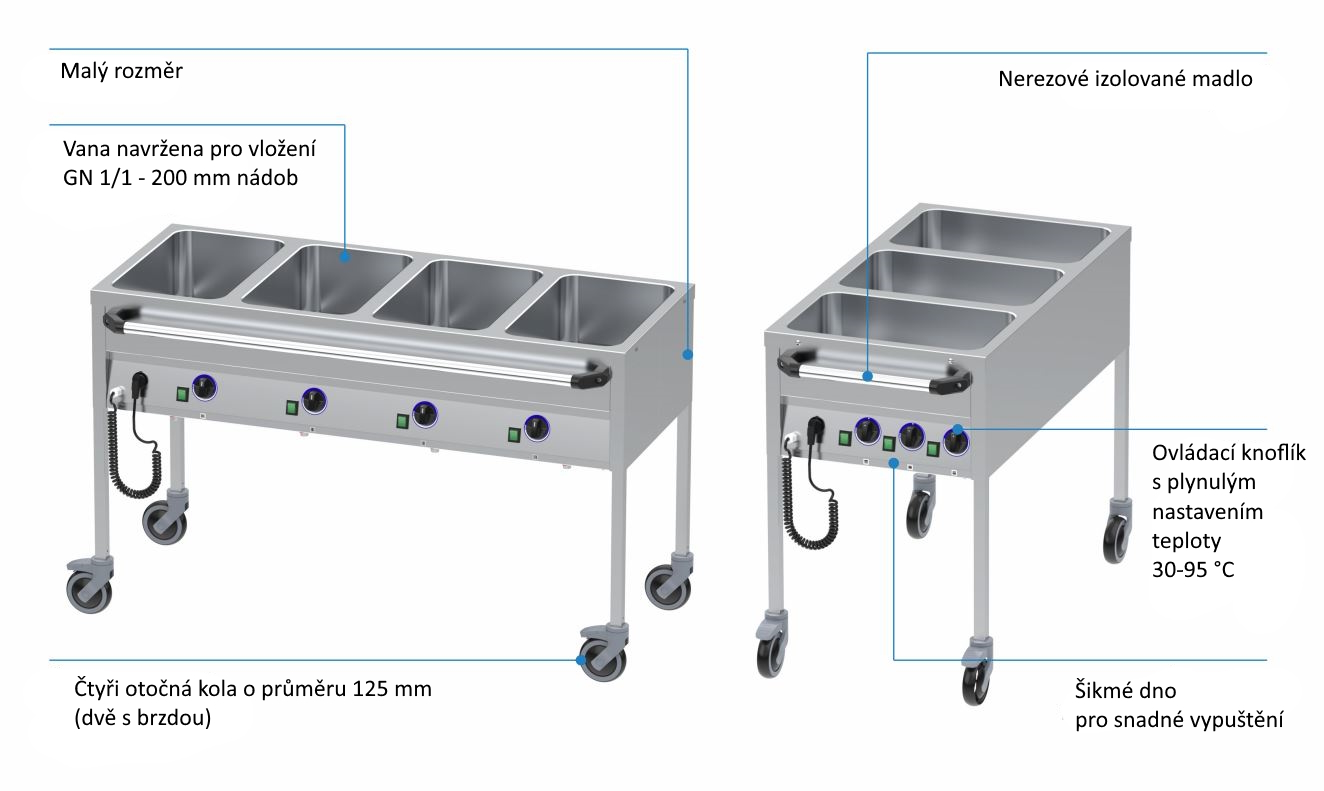 Ovládání na dlouhé straně. Dvě nádoby. Varianta s ohřevnou folií. Výdejní elektrický udržovací stůl bez police, který je vhodný pro transport a výdej připraveného jídla v GN nádobách.