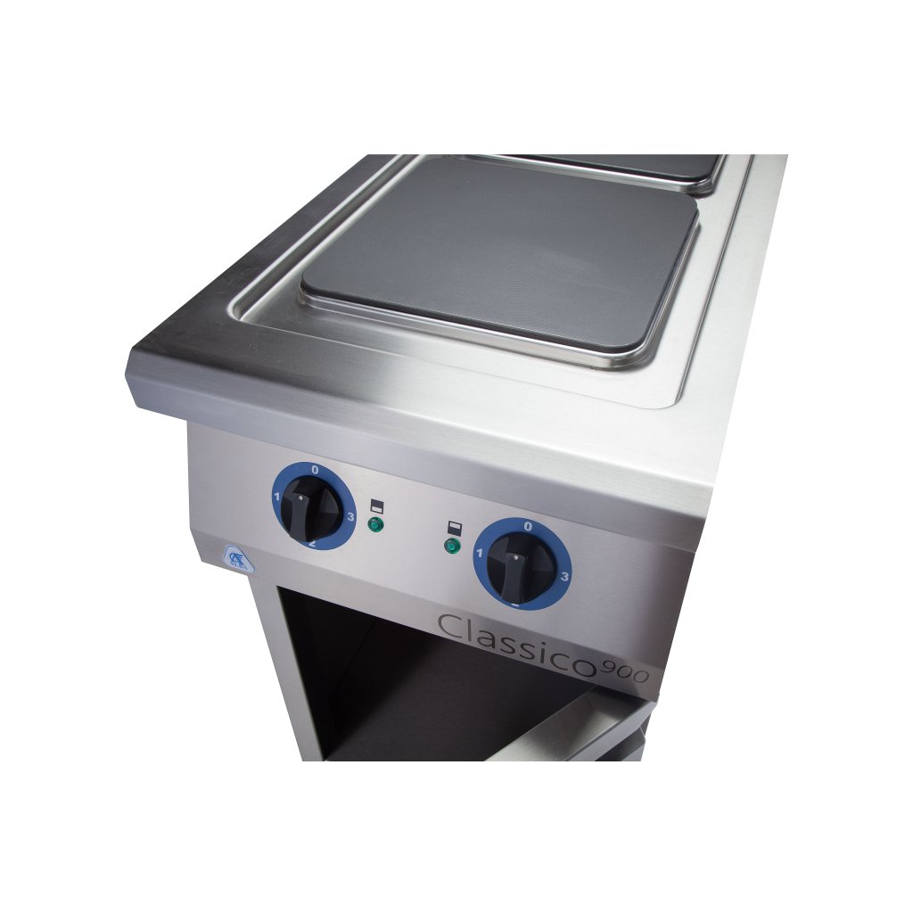 Velká šířka přístroje 450 mm - dostatečný varný prostor. 4 kW na jednu plotýnku - vysoký výkon pro efektivnější provoz, rychlé přivedení k varu. Termostatická ochrana proti přehřátí - větší životnost a nižší servisní náklady. Celonerezová konstrukce z kvalitní potravinářské oceli AISI 304 - EN 1.4301. Regulace topných těles čtyřpolohovým přepínačem. Signálka zapnutého stavu. Podstavce v několika variantách, vždy opatřeny všemi seřizovatelnými nožičkami. Se zadní zvýšenou odvětrávací mřížkou - lehce demontovatelnou pro vyčištění.Doplňkové parametry