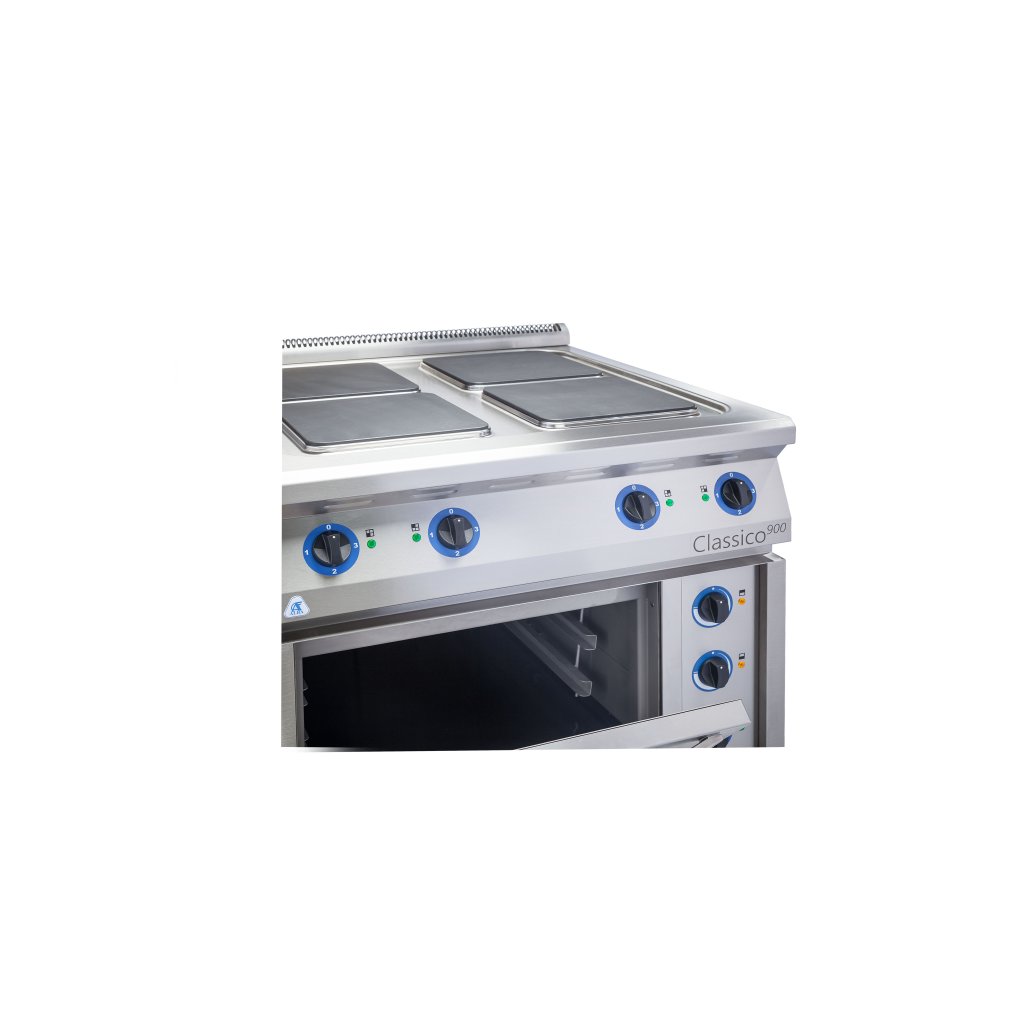 Velká šířka přístroje 900 mm - dostatečný varný prostor. 4 kW na jednu plotýnku - vysoký výkon pro efektivnější provoz, rychlé přivedení k varu. Termostatická ochrana proti přehřátí - větší životnost a nižší servisní náklady. Celonerezová konstrukce z kvalitní potravinářské oceli AISI 304 - EN 1.4301. Regulace topných těles čtyřpolohovým přepínačem. Signálka zapnutého stavu. Podstavce v několika variantách, vždy opatřeny všemi seřizovatelnými nožičkami. Se zadní zvýšenou odvětrávací mřížkou - lehce demontovatelnou pro vyčištění. 2 vsuvy uvnitř trouby.Doplňkové parametry