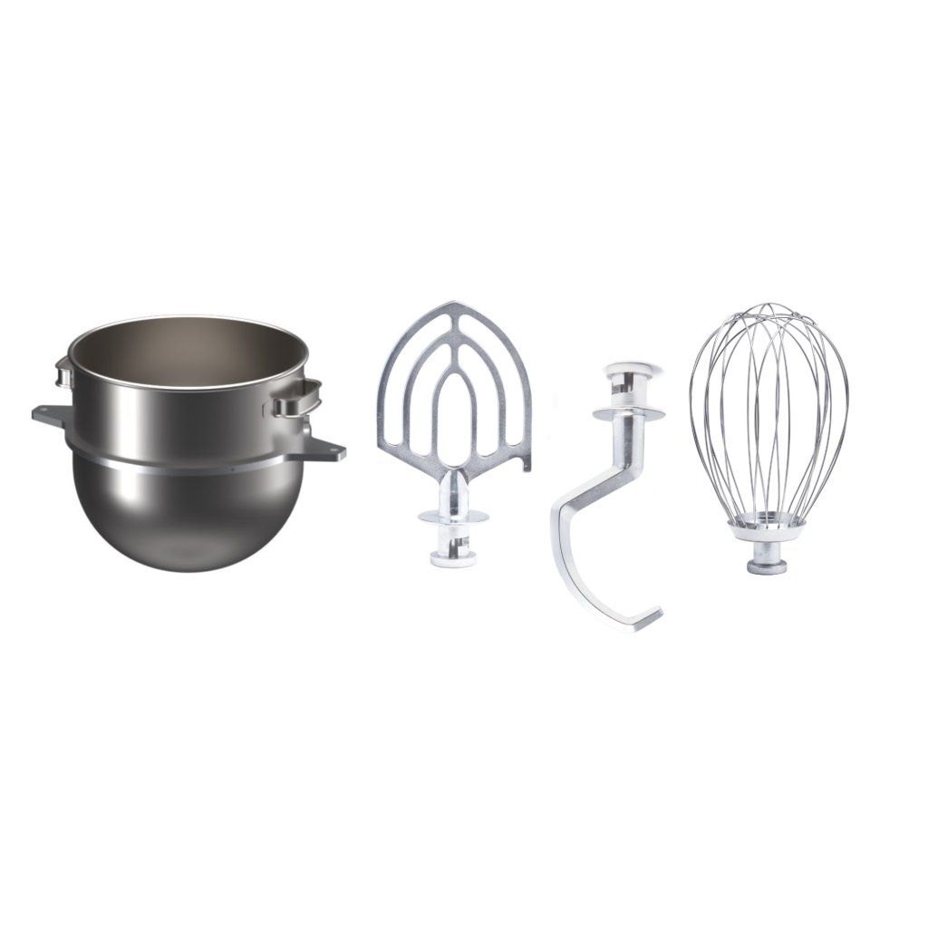 Sada příslušenství pro Univerzální šlehací a hnětací stroje RE 22 a RE 24 zahrnuje nerezový kotlík bez nutnosti redukce K 30 o objemu 30 litrů, redukční nosič kotlíku, hák H 30, míchač M 30 a šlehací metlu ŠM 60 kompatibilní se stroji RE 22 a RE 24. Všechny komponenty jsou vyrobeny z kvalitní nerezové oceli pro dlouhou životnost a odolnost.
