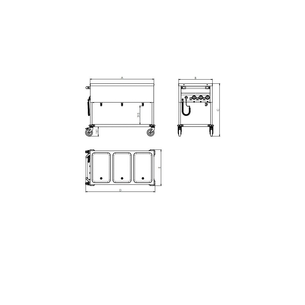 Výdejní elektrický udržovací stůl s policí, který je vhodný pro transport a výdej připraveného jídla v GN nádobách. Ovládání na krátké straně. Tři nádoby. Varianta s ohřevnou folií, která je vyhřívaná pomocí energeticky účinných, foliových topných těles s optimálním vedením tepla. Zkrácení doby ohřevu 3,5 l vody na 90 °C na max. 30 min. Úspora energie 30-40 % podle způsobu použití. Čtyř otočná kola o průměru 125 mm, z nichž dvě na přední straně jsou vybavená brzdou. Ergonomické a tepelně izolované madlo. Robustní, samonosné a hygienické provedení z vysoce kvalitní nerezové oceli. Plynule nastavitelná provozní teplota 30 - 95 °C. Každá z van může sloužit pro vložení nádoby GN 1/1-200. Vana se spádovaným dnem.