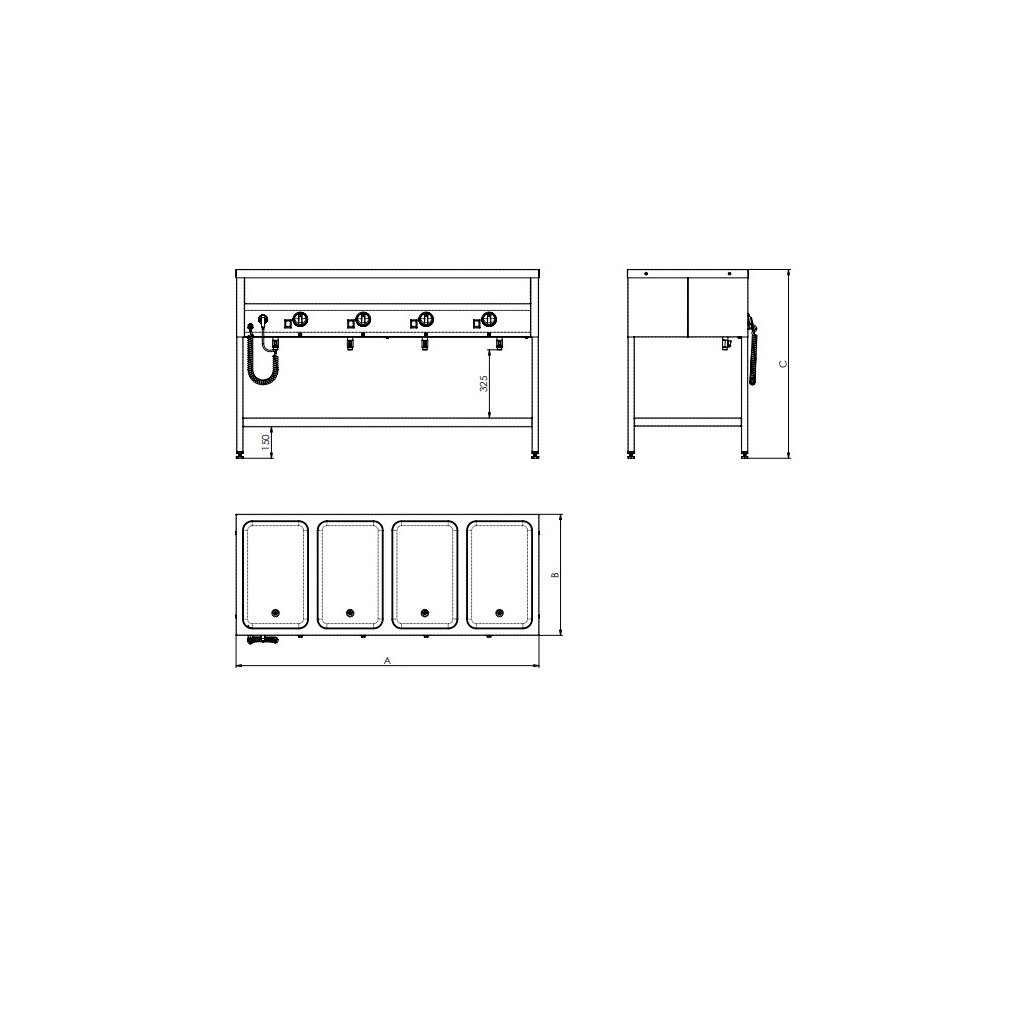 Výdejní elektrický udržovací stůl s policí, který je vhodný pro výdej připraveného jídla v GN nádobách. Ovládání na krátké straně. Dvě nádoby. Varianta s ohřevnou folií, která je vyhřívaná pomocí energeticky účinných, foliových topných těles s optimálním vedením tepla. Zkrácení doby ohřevu 3,5 l vody na 90 °C na max. 30 min. Úspora energie 30-40 % podle způsobu použití. Spodní police ve výšce 150 mm. Plynule nastavitelná provozní teplota 30 - 95 °C. Každá z van může sloužit pro vložení nádoby GN 1/1-200. Vana se spádovaným dnem.