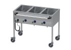 Ovládání na dlouhé straně. Čtyři nádoby. Varianta s topnými tělesy. Výdejní, elektrický, udržovací stůl s policí, který je vhodný pro transport a výdej připraveného jídla v GN nádobách.